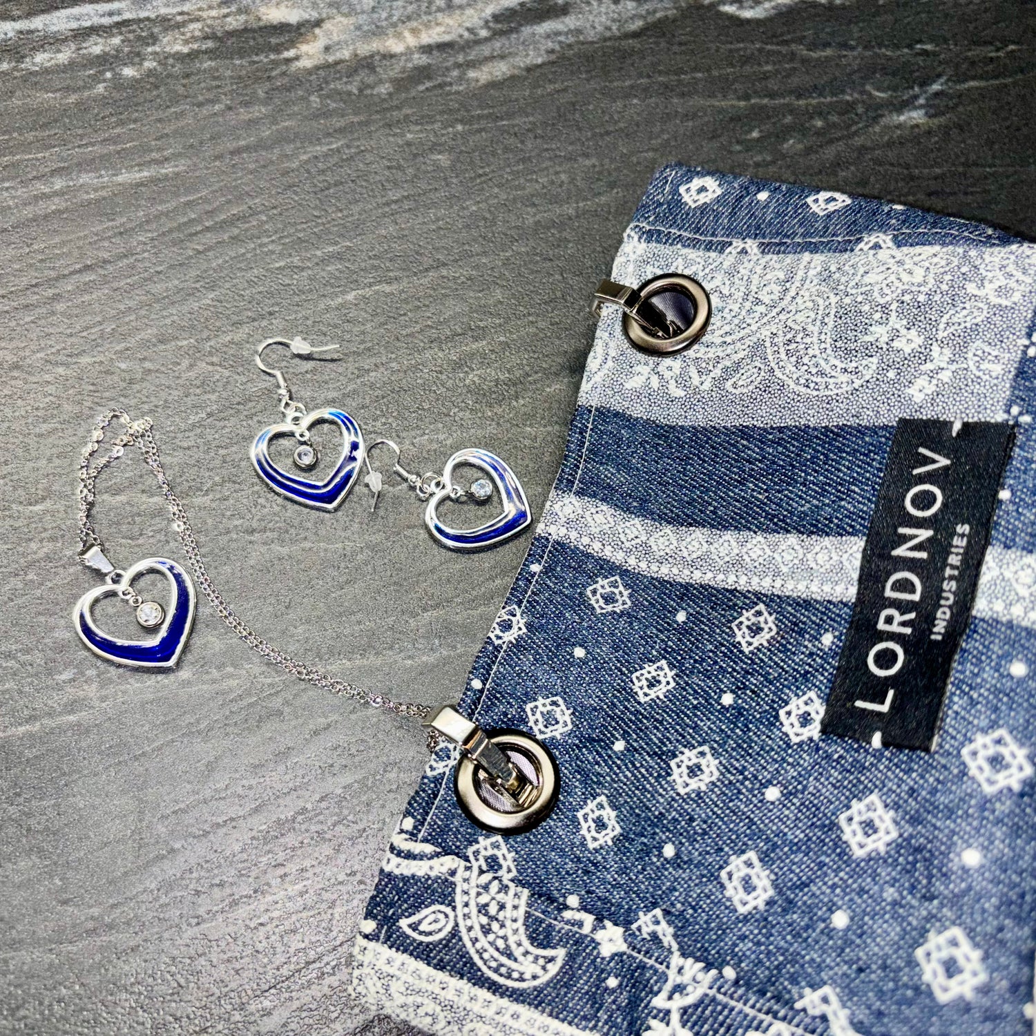 Questa esclusiva collaborazione tra Lordnov e YUGENMIRAI unisce artigianalità e design contemporaneo, dando vita a un set unico composto da una pochette in tessuto rigido effetto jeans e un elegante set di gioielli.